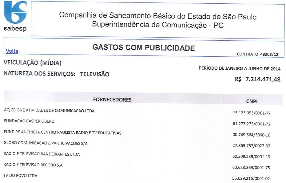 O DCM obteve as planilhas de investimento em publicidade da Sabesp nos anos de 2010, 2011, 2012, 2013, 2014 e 2015 até o mês de abril. De acordo com os documentos, a empresa gastou R$ 44.462.117,03 no ano passado, quando Geraldo Alckmin foi reeleito no auge da crise da falta de água com pouca cobrança na imprensa. As operações fazem parte do plano de investimentos de uma companhia com valor de mercado estimado em R$ 15 bilhões.